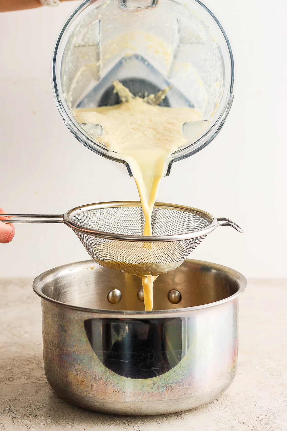 - Strain the corn mixture into the pot using a fine mesh strainer. Stir in 1 cup of the remaining milk and the vanilla extract. Continue to gently simmer the atole mixture for 5 minutes, stirring continuously.
