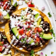 You can easily make these black bean tostadas more hearty and filling by adding different proteins. Spread a layer of this black bean mixture and then top with beef tinga, carnitas, shredded chicken, or sofritas for a vegan/vegetarian option.