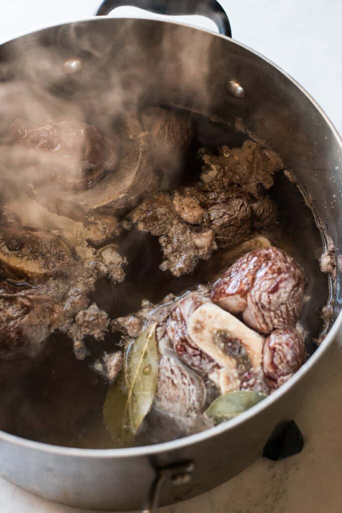 - Skim off and discard any white or brown foam floating at the top of the pot as well as the bay leaves and garlic cloves. Transfer the cooked bone-in beef shank to a bowl and set aside to cool slightly.