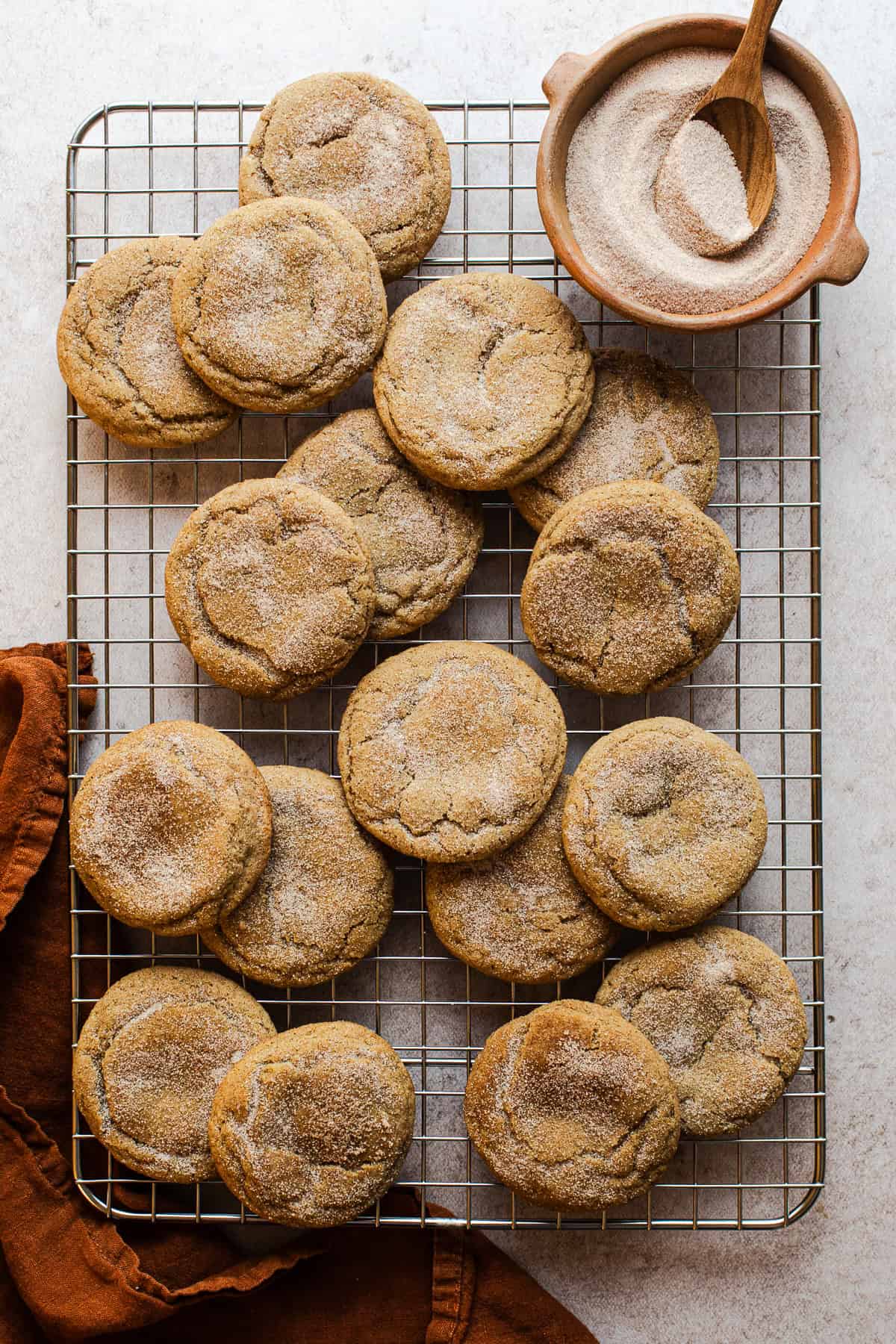 • Storage. Transfer cookies to an airtight container and store at room temperature for up to 5 days for optimal freshness or in the freezer for up to 3 months. To freeze the unbaked cookie dough, transfer the cookie dough balls rolled in cinnamon sugar to a freezer bag or container and freeze until ready to bake. Bake the frozen cookie dough at 350℉ for 12-13 minutes.