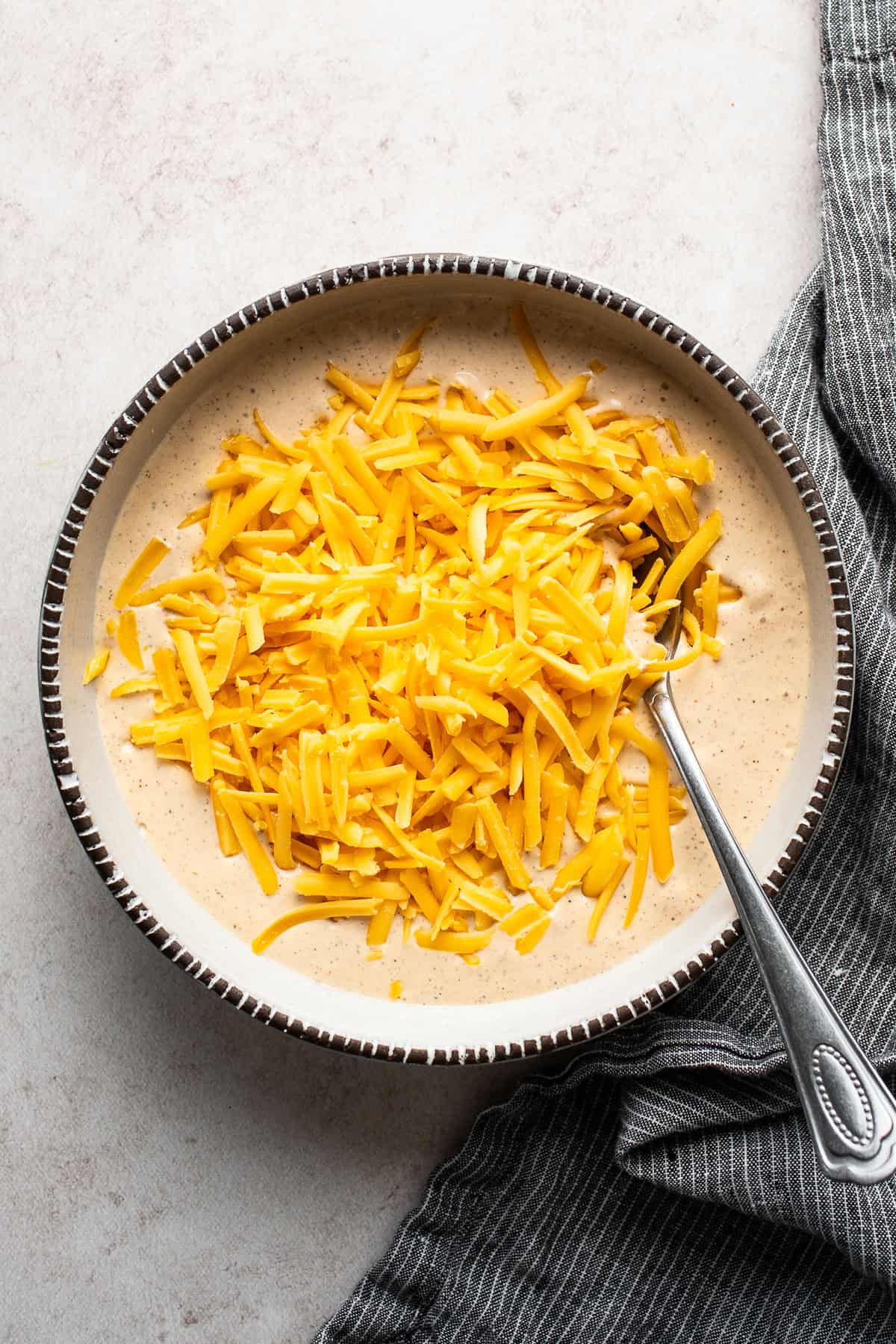 - Microwave for 30 seconds. Stir in shredded cheese and whole milk until fully combined and microwave for an additional 15-30 seconds until warm.