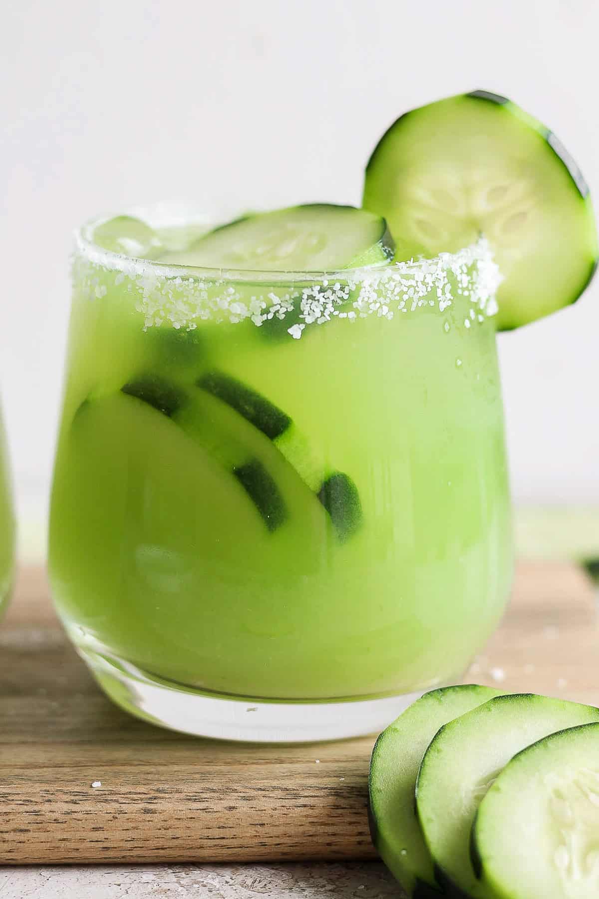 Serve your cucumber margarita in a chilled glass with a salted rim, garnished with a cucumber slice or lime wheel.