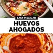 They’re similar in that both dishes feature eggs cooked directly in a simmering sauce. The big difference is the flavor profile. Shakshuka is typically made with tomatoes, bell peppers, and warm spices like cumin and paprika, while huevos ahogados are cooked in a Mexican red salsa made from dried chiles, tomatoes, garlic, and Mexican oregano. Same concept, totally different flavor.