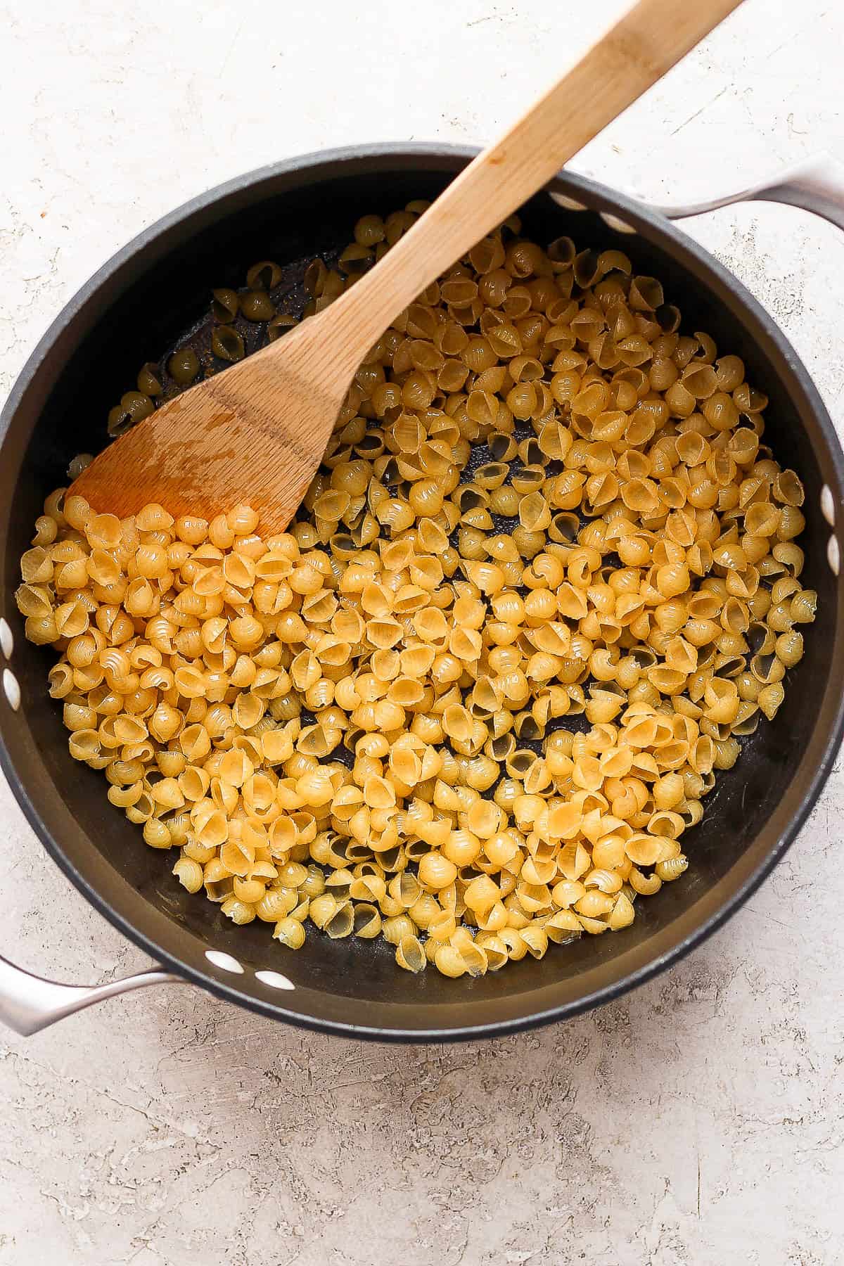 - Heat the olive oil in a medium pot over medium heat. Add the shell pasta and stir to coat it evenly with oil. Toast until golden brown for 3 to 4 minutes, stirring occasionally.