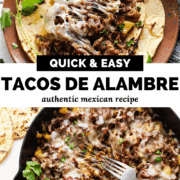 Tacos de Alambre are a one-pan Mexican dish loaded with bacon, chorizo, tender steak, bell peppers, and gooey melted cheese all piled into warm tortillas. Serve these family-style for a fun and irresistible dinner!