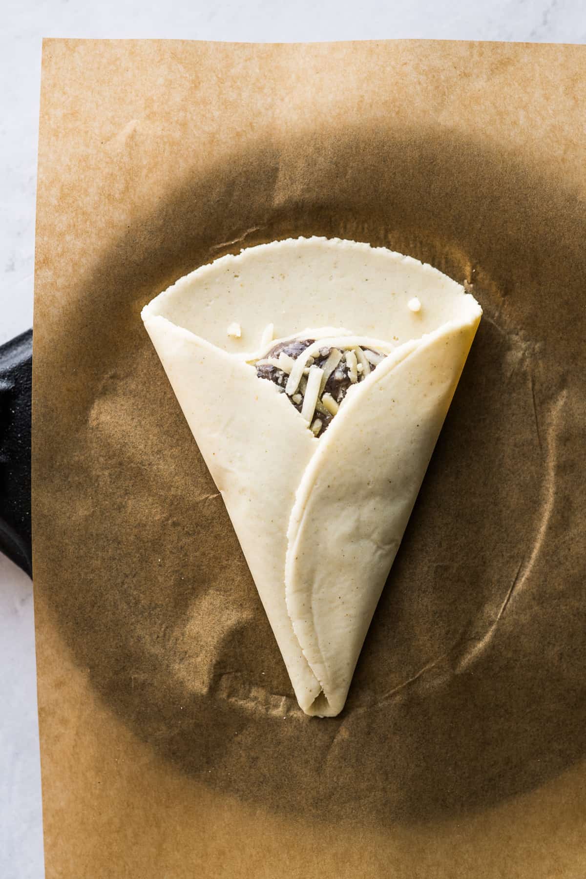 - Fold over the bottom side of the masa, then the top right corner and the top left corner to form a triangle. Gently press down each time you fold to seal the beans and cheese inside the dough.